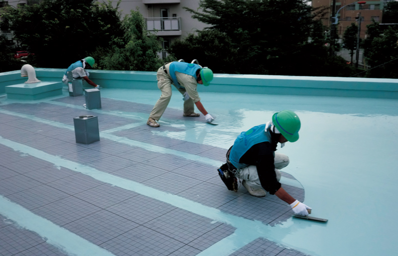 合成ゴムでできた防水シートをシート状に成形し、貼り付けていく工法です。人の歩行がない屋上や屋根などの防水工事に用いられます。ゴムは軽量・短工期・低コストの素材です。