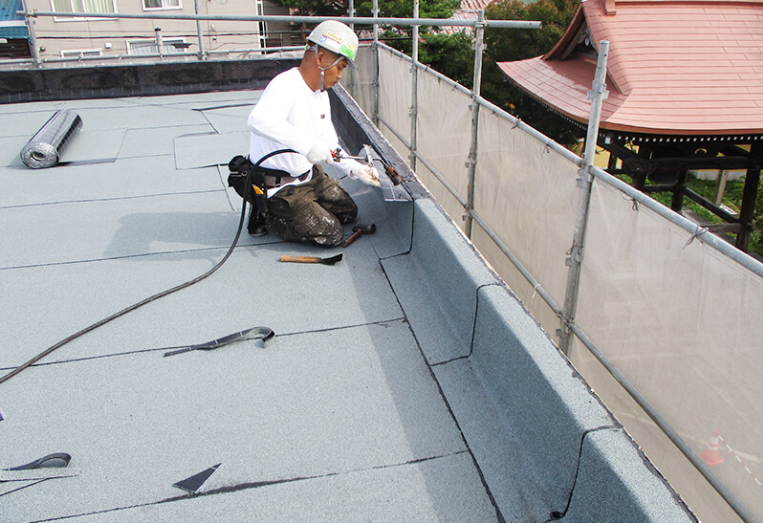 アスファルトシートと液状溶解アスファルトを組み合わせ、防水層をつくります。防水性や気密性、耐久性などが高く、低コストでの施工が可能です。水平な屋根への施工に適しています。