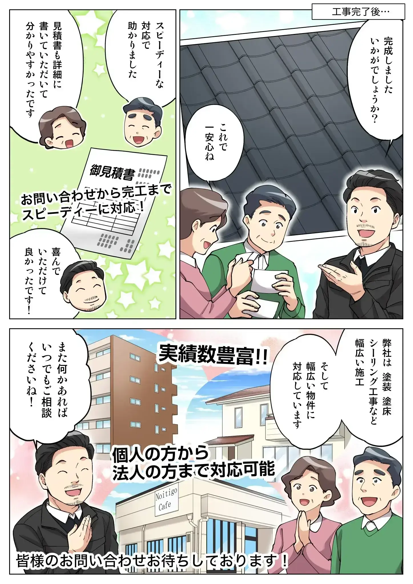 これまでに、多くのお客様から工事の施工をご依頼いただき、実績を積み上げてまいりました。今後も、さらに施工技術を磨き、お客様にご満足いただける施工をお届けいたします。